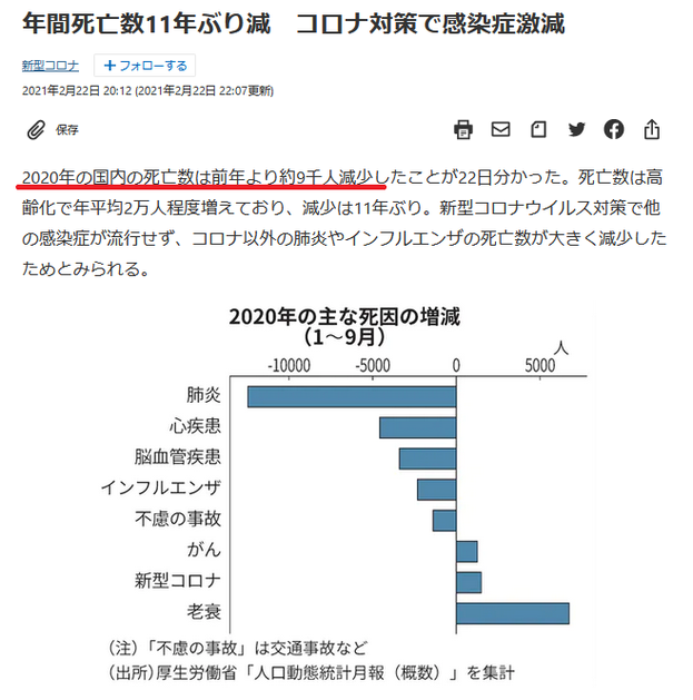 「2020年国内の年間死者数が2019年比較で9000人の減少」