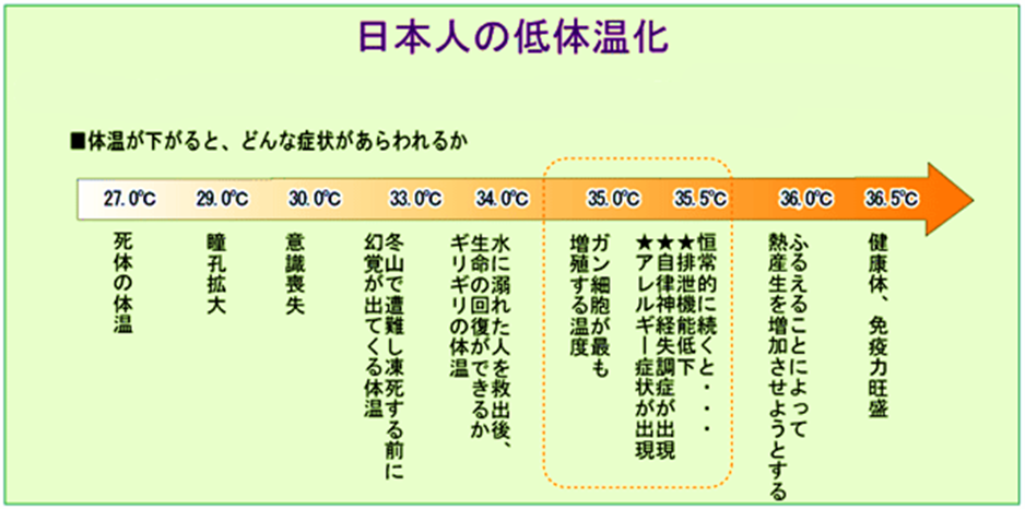 私達の身体は36.5~37度が最も健康的で理想的といわれていて、「体温が1℃下がると代謝は約12%、免疫力は約30%近く低下」し、体調を崩しやすくなると考えられています。